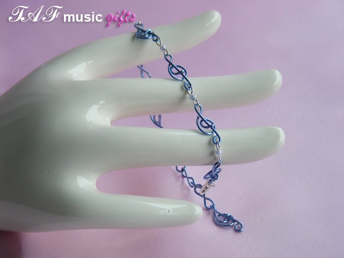 A lovely blue bracelet from TAF Music Gifts has 7 blue treble clefs made of copper wire. All treble clefs are joined by small white seed bead links. This music themed bracelet has a silver clasp and overall adjustable length is about 17cm to 20cm.