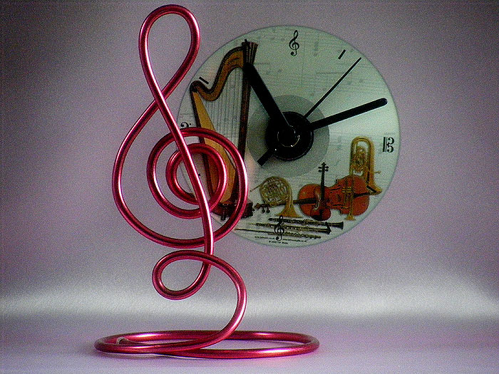 A modern CD clock is supported by a striking hot pink treble clef made of thick aluminium wire to create this beautiful distinctive music themed clock. The CD face is printed with varieties of orchestral musical instruments. This clock from TAF Music Gifts makes a special gift for musicians, family and friends. As each clock is individually handmade, each one is unique. The overall measurement is about 8" high, 6" wide and 4" deep.