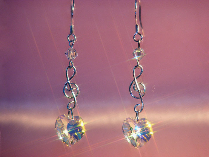 These earrings from TAF Music Gifts feature treble clefs made of 925 sterling silver wire and each treble clef has a 10mm Swarovski heart AB bead suspended below. Earrings have 925 silver hooks and overall length is about 5cm. These classy earrings make lovely music gifts for musicians, family and friends.