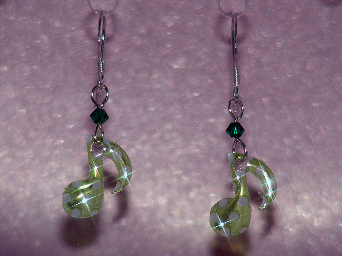 These music themed earrings from TAF Music Gifts feature attractive light green translucent quavers decorated with a 3mm green Swarovski crystal bead. Earrings have 925 silver hooks and overall length is about 3cm. These earrings make lovely gifts for musicians, family and friends.