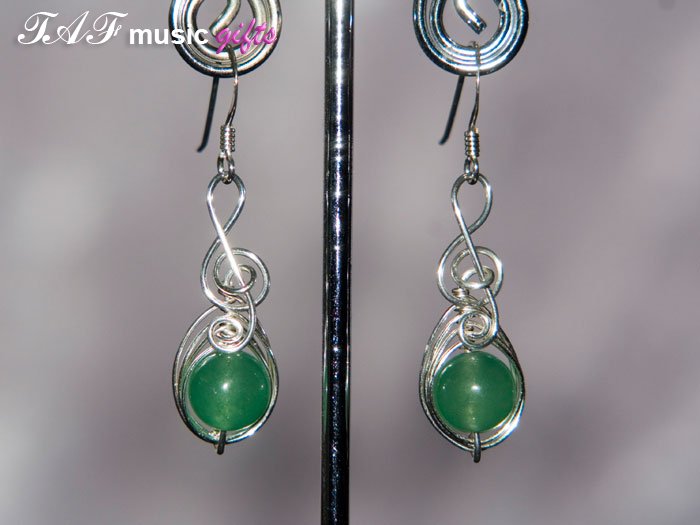 These earrings from TAF Music Gifts have treble clefs made of silver plated copper wire. Each treble clef is focused on a 8mm green round Aventurine bead. Earrings have 925 silver hooks and the overall length is about 4cm. These attractive earrings make great gifts for musicians, family and friends.