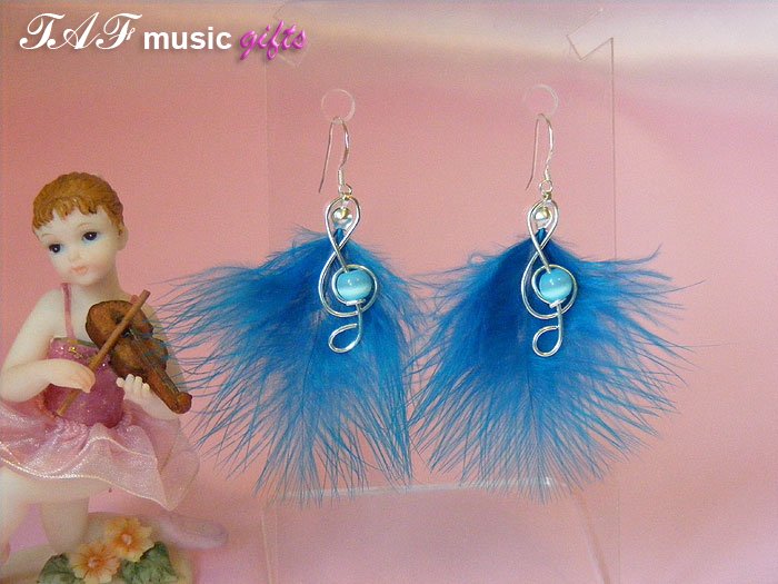 These funky earrings from TAF Music Gifts feature lovely sky blue feathers adorned by handmade silver treble clefs with a 6mm blue cat eye bead as a center. Earrings have 925 silver hooks and overall length is about 6 to 8cm depending on the the length of the feathers. These funky earrings make great music gifts for musicians, family and friends.