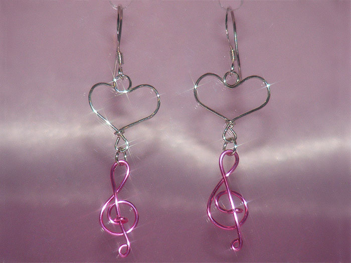 These pink heart earrings from the handmade jewellery range have treble clefs made of pink coated copper wire and are decorated with silver plated wire hearts. It have 925 silver hooks and overall length is about 4.5cm.