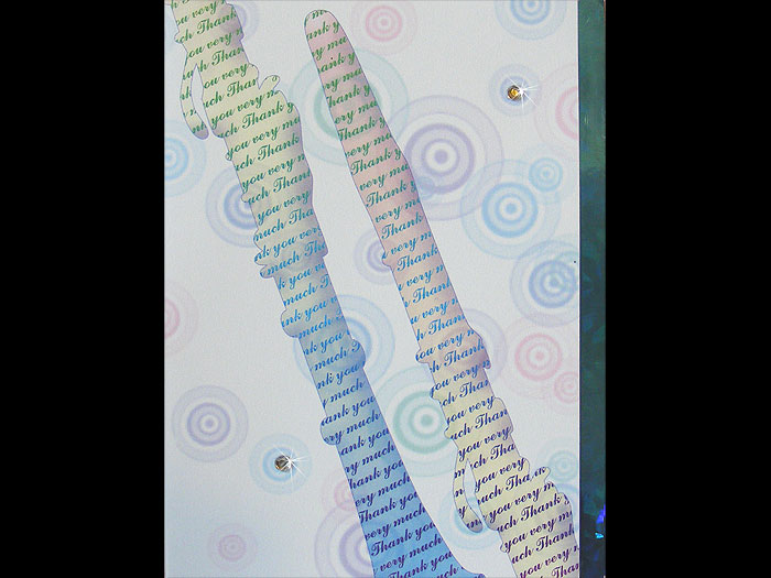 The clarinet card from TAF Music Gifts has a concentric circle design with a clarinet imprinted "Thank You" on it. There is a blue hologram strip on the right hand side and a couple of rhinestone gems to give a sparkle effect. Inside of the card is left blank for you to write your own message. Card size is approx 115mm x 155mm.