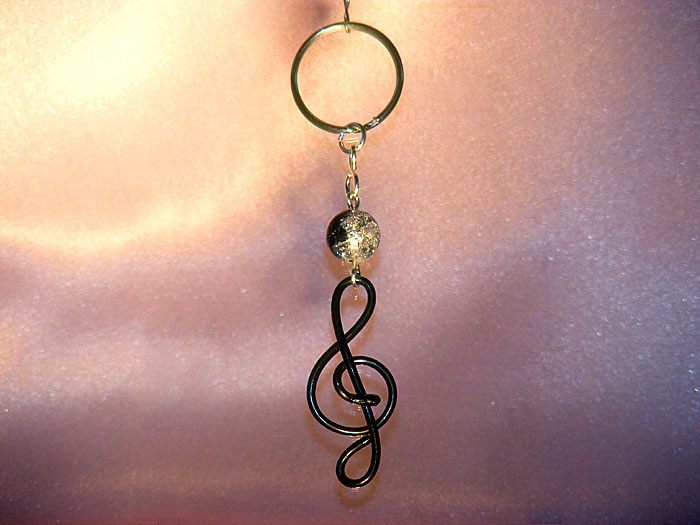 A music themed key ring from TAF Music Gifts features a jet black treble clef and is decorated with attractive black and clear 12mm crackle glass.