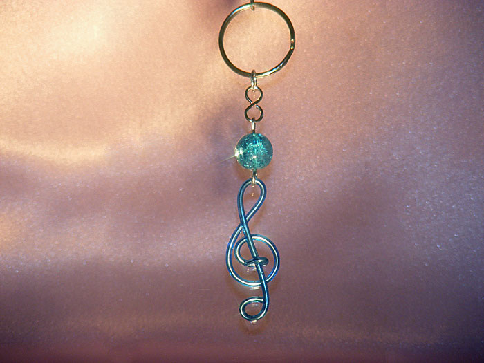 A music themed key ring from TAF Music Gifts features a lovely blue treble clef and is decorated with attractive blue and clear 12mm crackle glass.