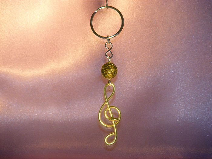 A music themed key ring from TAF Music Gifts features a bright yellow treble clef and is decorated with an attractive olive colour 12mm crackle glass.