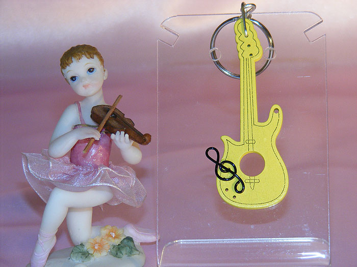 Yellow "Stratocaster" style guitar key ring from TAF Music Gifts is made of wood and is decorated with a handcrafted black treble clef. The guitar is about 7.3cm long.