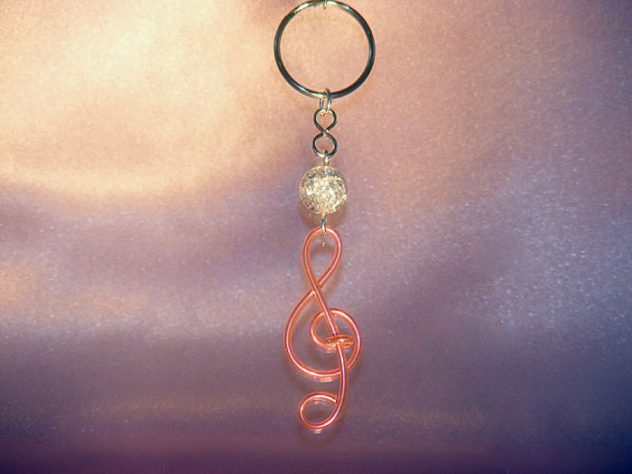 A music themed key ring from TAF Music Gifts features a neon pink treble clef and is decorated with a attractive pink and clear 12mm crackle glass.