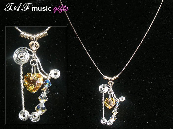 An unique music themed necklace from TAF Music Gifts features a 10mm heart Swarovski crystal bead in the center of a hand made silver harp decorated with crystal beads on the right hand side to represent the harp body for added sparkles.