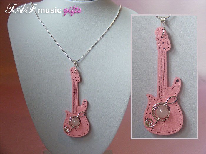Rose Quartz hot pink guitar necklace, other music jewellery and non-jewellery gifts are designed and handmade in Herefordshire UK workshop. They make great music themed gifts for musicians, family and friends.