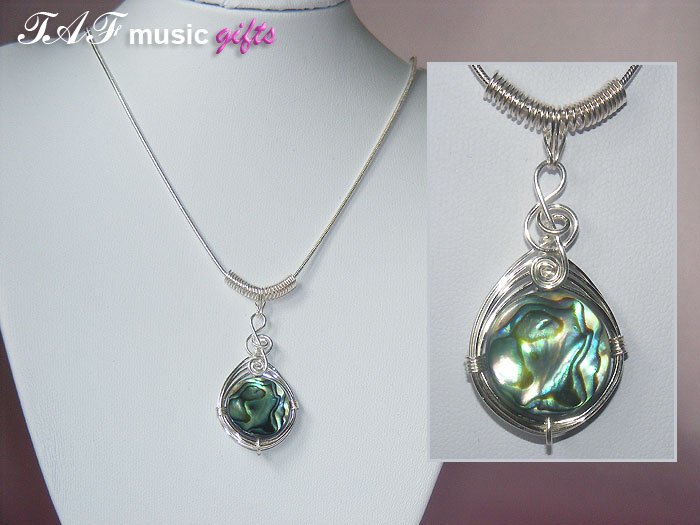 This treble clef necklace from TAF Music Gifts features a 15mm round shimmering colouful Abalone / Paua shell. The shell is lovely decorated with silver wires and a treble clef.
