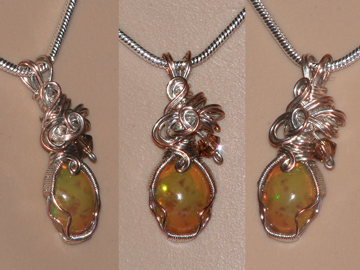 This Opal necklace from TAF Music Gifts features a semi-transparent Ehtiopia Wello opal. The design has an heirloom feel - with its intertwined silver plated wires purposely revealing copper wires underneath and is enhanced with a Swarovski crystal bead for extra sparkle. The distinct two-tone opal gemstone with its colours ranging from green at the top to orange at the bottom. Bright orange flashes liberally scattered throughout the stone bring real fire to this unique item.