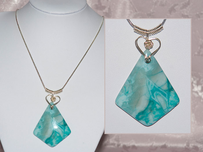 This handmade necklace from TAF Music Gifts features an unusual pattern turquoise colour kite shaped Agate gemstone. It has a hand made heart silver plated bail.