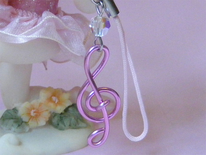 These phone charms from TAF Music Gifts have a 30mm pink treble clef made of 1.5mm Aluminium wires decorated with a 6mm Swarovski crystal bead.