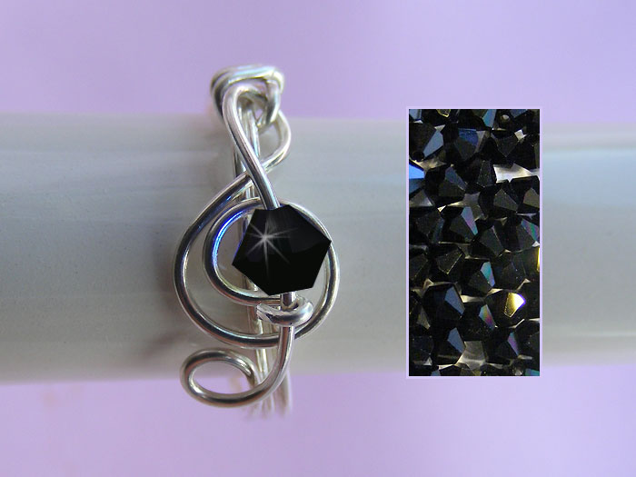 The ring has a treble clef made of silver plated copper wire centered with a 4mm jet black Swarovski crystal bicone bead. They are handmade musical themed jewellery and make great gifts for musicians, family and friends.