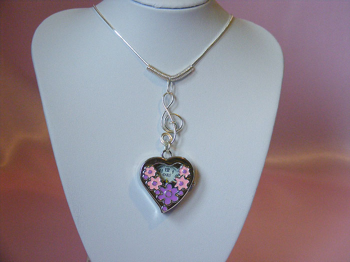 This heart music themed watch necklace is decorated with a hand-crafted silver treble clef made of 1mm silver plated wires. The pendent (heart and treble clef) is about 8cm x 3cm and the necklace have a 24" (60cm) silver plated snake chain.
